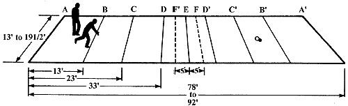 - *Toss is valid if the pallino passes center line and is at least 6″ from the side walls and at least 1′ from the back wall and does not touch the back wall on opposite end.